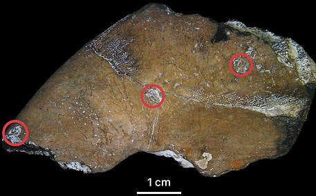 In this image you can clearly see fish scales and possible bone remains. Under closer magnification there are 2 fish jaws and well preserved vertebrae.